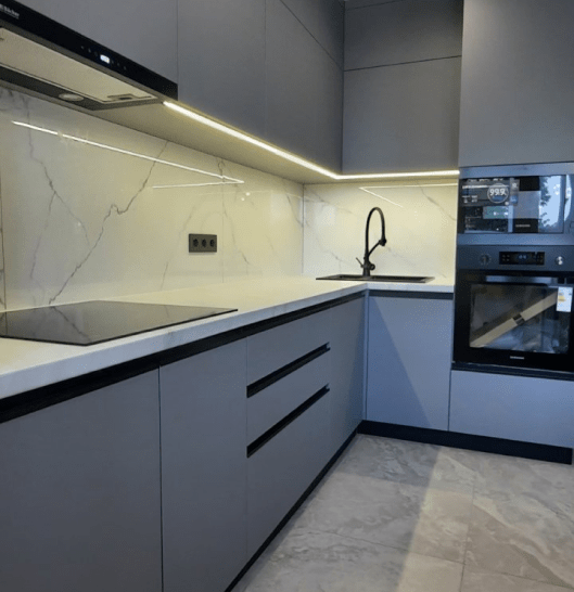 Пластик, акрил и краску лучше использовать на фасадных частях кухонь и другой мебели. Эти материалы являются более практичными. В крашенных элементах можно использовать большое количество